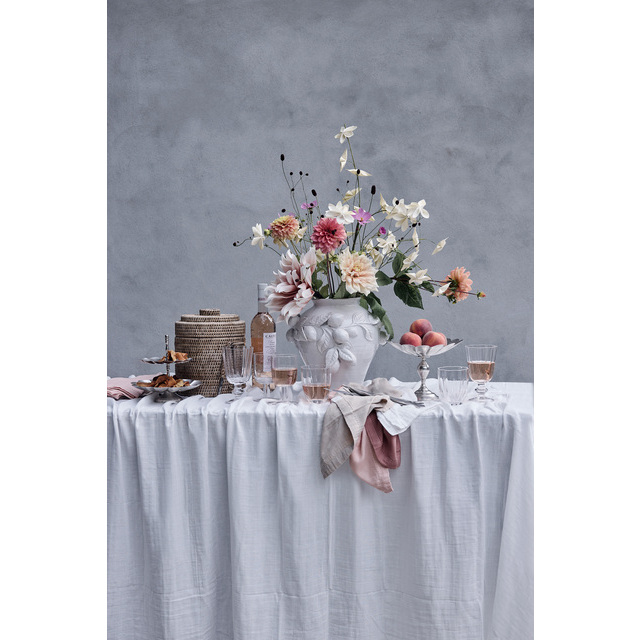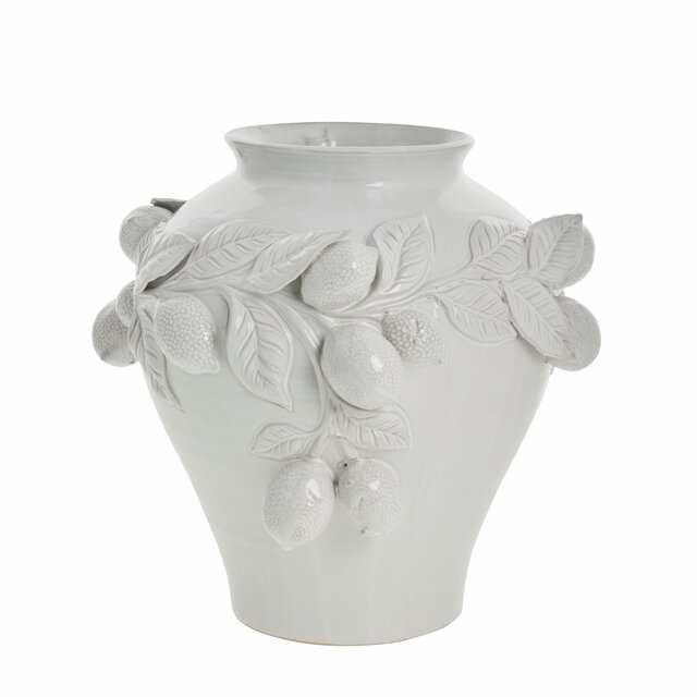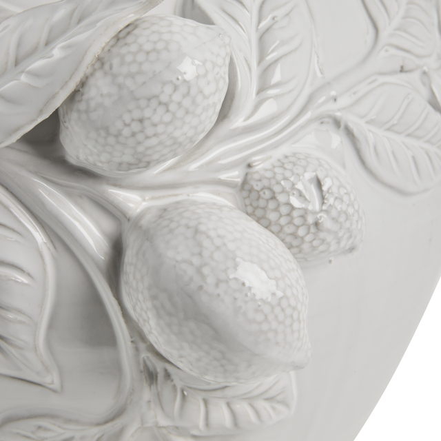 Stunning lemon vase from Lene Bjerre. Crafted in white ceramics and adorned with sculptural lemons and leaves in exquisite relief, it embodies timeless craftsmanship with a playful yet elegant touch. The detailed design brings depth and texture, while the monochrome finish adds a Scandinavian feel. Perfect as a statement piece on its own or filled with fresh greenery and blooms, it captures the essence of Mediterranean charm blended with Nordic refinement.